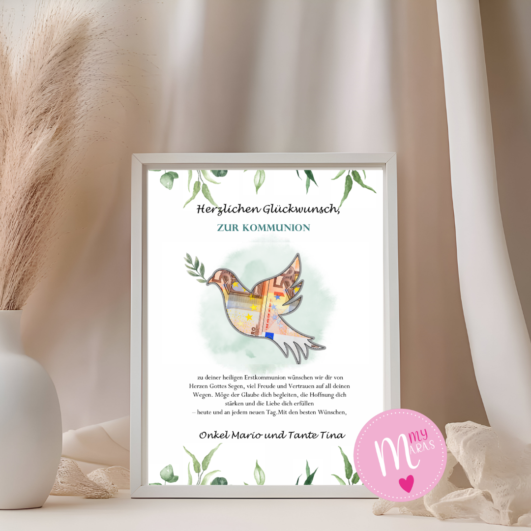Einfach den vorgesehenen Bereich nutzen, um ein Geldscheinchen zu befestigen 💶 – so wird dein Geschenk zur Erstkommunion zu einer liebevollen und persönlichen Überraschung! 🌿